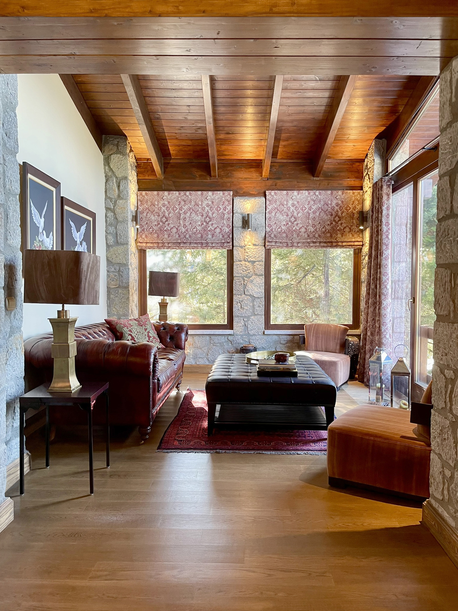 Natural structural materials, such as stone and wood, create a perfect balance and harmony with the surrounding landscape. Warm shades and earth tones combined with refined upholstery fabrics in custom-made furniture and shading, create a cozy and luxurious ambiance, embodying comfort and sophistication. Bronze details in lighting follow nature forms, emerging the style of the interior.
